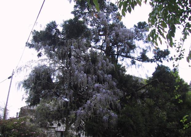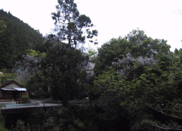 少し離れた川向からとると大蛇藤の全景がとれるのですけど 花がわかりにくくて・・。公民館のところまであがってとるときれいに花はとれますねー・・。